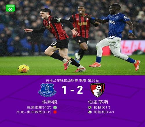 伯恩茅斯21逆轉(zhuǎn)十人埃弗頓,拉揚、阿德利破門,恩迪亞耶點射