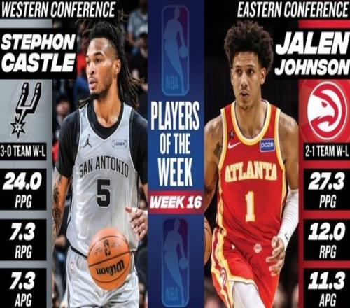 NBA官方公布了第16周的東西部周最佳球員,東部由老鷹前鋒杰倫約翰遜當(dāng)選,西部由馬刺后衛(wèi)卡斯?fàn)柈?dāng)選。杰倫約翰遜上周場(chǎng)均豪取27.3分+12籃板+11.3助攻,帶領(lǐng)老鷹取得2勝1負(fù)的戰(zhàn)績(jī)。據(jù)統(tǒng)計(jì),這是杰倫約翰遜本賽季第2次拿到周最佳球員獎(jiǎng)。卡斯?fàn)柹现軋?chǎng)均貢獻(xiàn)24分+7.3籃板+7.3助攻,帶領(lǐng)馬刺隊(duì)取得3勝0負(fù)的戰(zhàn)績(jī)。據(jù)統(tǒng)計(jì),這是卡斯?fàn)柹氖状潍@得該獎(jiǎng)項(xiàng)。除此之外,猛龍隊(duì)的巴恩斯、尼克斯隊(duì)的布倫森和唐斯、76人隊(duì)的大帝和馬克西、騎士隊(duì)的米切爾、雄鹿隊(duì)的羅林斯、開(kāi)拓者隊(duì)的克林根和格蘭特、快船隊(duì)的小卡、鵜鶘隊(duì)的墨菲和馬刺隊(duì)的文班亞馬等球星獲得了周最佳提名。