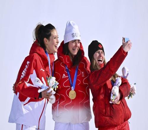 2月9日的自由式滑雪女子坡面障礙技巧決賽賽后,亞軍中國選手谷愛凌(左)和冠軍瑞士選手瑪蒂爾德·格雷莫德(中)、季軍加拿大選手奧爾德姆在領獎臺上合影。新華社記者 張宏祥 攝