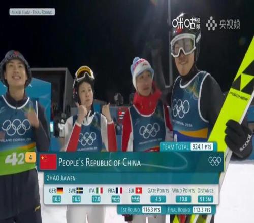 在跳臺(tái)滑雪混合團(tuán)體比賽中,由曾坪、宋祺武、劉奇、趙嘉文組成的中國(guó)隊(duì),也以總分924.1的成績(jī)獲得第8名,刷新中國(guó)體育代表團(tuán)冬奧會(huì)該項(xiàng)目的最好成績(jī)。