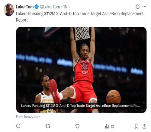 北京時(shí)間2月14日晚,湖媒Laker Tom也透露,在2026年休賽期湖人隊(duì)有引進(jìn)三年1.12億合同的墨菲的打算。