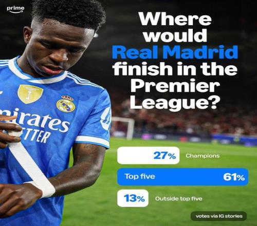 皇馬作為足壇的頂級豪門,在西甲聯賽大部分時間里都是在和巴薩競爭聯賽冠軍的位置,如今英超聯賽關注度提升,影響力和收入都是足壇第一聯賽,自然也有球迷好奇皇馬如果去到英超能排在第幾的位置。轉播商亞馬遜發(fā)起了一次球迷調查,就問了球迷這個問題,現在的皇馬去英超能排在第幾?從投票結果來看,只有27%的球隊認為皇馬能夠奪冠,61%的球迷認為皇馬能夠排在前5,也有13%的球迷認為皇馬拿不到歐冠名額。