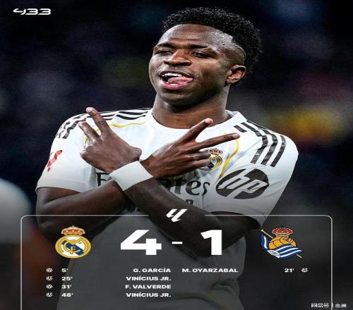 西甲第24輪,皇馬主場(chǎng)4-1擊敗皇社,先賽60分登頂。阿諾德妙傳助攻貢薩洛先拔頭籌,赫伊森送點(diǎn),奧亞薩瓦爾點(diǎn)射扳平,維尼修斯兩次造點(diǎn)+點(diǎn)射,巴爾韋德遠(yuǎn)射破門(mén)。