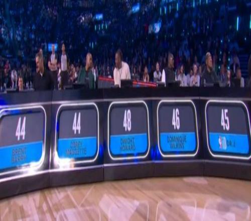 第四位登場的是湖人中鋒海斯,他從后場啟動后從三分線開始助跑,在罰球線以里完成一次樸實無華的暴扣,僅得到44.6分。