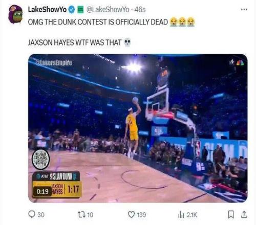 我以為 約翰遜要扣一個驚天動地的,結(jié)果他竟然致敬海斯,扣了個拉在地上的,47.8分,47分都是給他的舞蹈的。