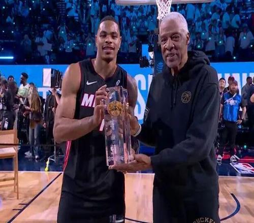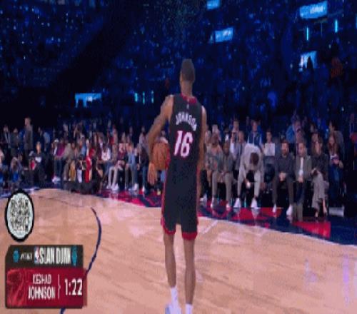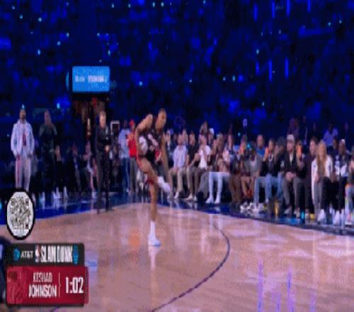 首輪最大的亮點(diǎn)是熱火的約翰遜,這哥們兒不知道從哪請來了灣區(qū)說唱老炮E-40。老頭往籃下一站,約翰遜直接起飛,飛躍這位60歲大爺?shù)耐瑫r,最后摸著后腦勺單手扣進(jìn),47.4分。