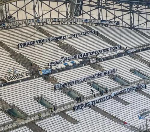 此外本場比賽還遭到了馬賽球迷的空場(部分看臺)抗議,球迷橫幅上寫道:“空空如也的看臺以示抗議,對于一個自我毀滅的俱樂部而言,你們所有的計劃都在這些荒廢的歲月中化為泡影”。