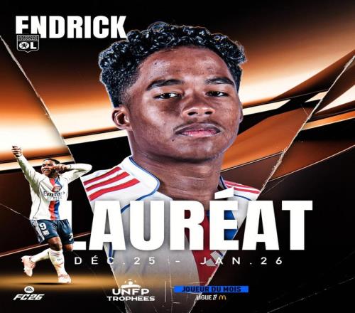 北京時間2月15日,官方消息,里昂前鋒恩德里克當(dāng)選法甲1月最佳球員。