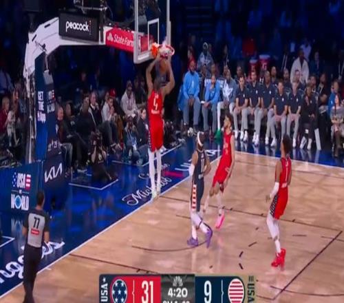 之后新星隊開始提速,華子接球回傳馬克西,馬克西上籃遭遇詹姆斯追帽,裁判吹罰干擾球,新星隊5-1反超。布克推過來傳籃下大空位杜倫,助其輕松扣籃,比分7-1;星條隊這邊,老詹控球過來左翼單挑杜倫,底線出手未果,杜蘭特補籃板后突開布克上籃,被坎寧安蓋帽,馬克西收板長傳,布克左翼三分命中,新星隊10-1擴大領(lǐng)先,隨后馬克西再借失誤上籃得手,12-1打停星條。