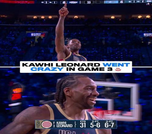 文班亞馬繼續(xù)強(qiáng)勢帶隊(duì),他單節(jié)獨(dú)得19分2籃板。但這一節(jié)完全成為萊昂納德的個人表演,他13投11中,三分7中6,一人狂砍31分!最后時(shí)刻還用一記三分球幫助條紋隊(duì)鎖定勝局。