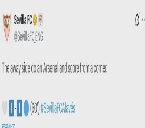 塞維利亞官推在更新比賽比分時揶揄了一把阿森納,他們寫道:“客隊(阿拉維斯)像阿森納那樣,打進(jìn)了一粒角球?!?/p>