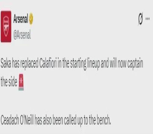 阿森納官推確認(rèn),薩卡取代卡拉菲奧里進(jìn)入了首發(fā)陣容,并且擔(dān)任隊長,小將奧尼爾進(jìn)入了替補(bǔ)席。