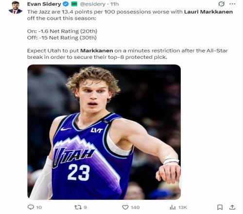 因為馬卡的個人發(fā)揮對球隊影響過大,預計爵士隊在全明星周末后會限制他的登場時間,以確保爵士隊在2026年拿到前八順位。