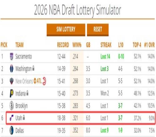 目前爵士隊18勝38負,狀元簽概率9%,前四簽概率37.2%,因為這個首輪簽是受保護的,爵士隊必須拿到前八順位才能自己手握所以爵士隊在全明星周末后會加劇擺爛。