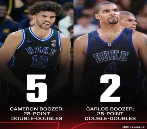 據(jù)ESPN報道,在卡梅隆布澤爾目前已出戰(zhàn)的26場NCAA比賽里,他已經(jīng)拿到了5次得分至少25分的兩雙數(shù)據(jù)。而他老爹卡洛斯布澤爾在其生涯所代表杜克大學(xué)出戰(zhàn)的101場比賽里,僅僅拿到兩次25+兩雙。由此可見,卡梅隆布澤爾真的是完美演繹了何謂長江后浪推前浪,一代更比一代強!