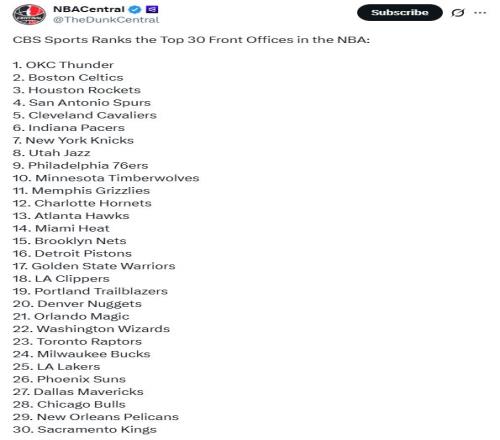 常規(guī)賽過半進(jìn)入全明星周末之際,美媒《CBS》根據(jù)本賽季前半程最新表現(xiàn)重新評價NBA各隊管理層水平排名,其中雷霆隊毫無疑問高居第一,陷入困境的火箭隊仍高居第3,勇士隊17名,湖人僅排25位。
