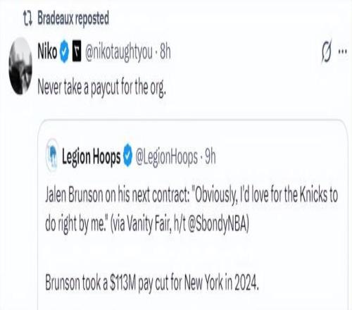 美記Niko評價布倫森的言論:永遠(yuǎn)不要為了這些球隊組織選擇降薪。(他暗示布倫森被尼克斯坑慘了)