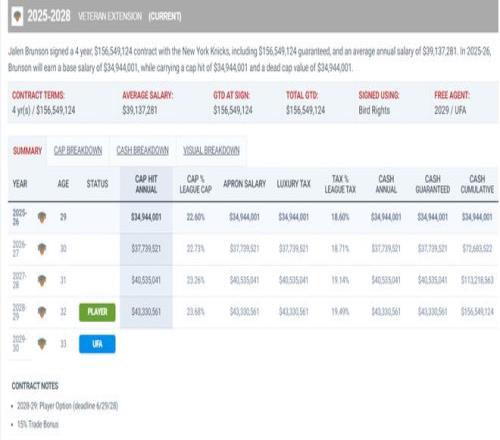 布倫森希望在2028年夏成為自由球員時公正的對待他下一份合同,因為他主動接受了大幅度降薪來幫助尼克斯組建布倫森、布里奇斯、阿奴諾比、唐斯的核心陣容。