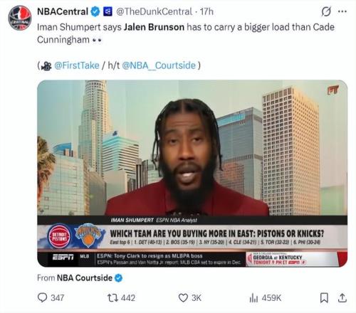 前NBA球員伊曼-香波特評價布倫森與坎寧安兩個東部頂級控衛(wèi),他表示布倫森所在環(huán)境比坎寧安難很多,布倫森要承擔(dān)的壓力遠(yuǎn)遠(yuǎn)超過坎寧安。