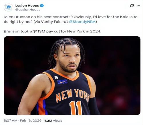 北京時間2月18日,根據(jù)美媒Sbondy NBA的消息,尼克斯球星杰倫-布倫森談到了關(guān)于下一份合同的看法,他說道:顯然,我希望尼克斯能善待我。此前布倫森在2024年夏跟尼克斯提前續(xù)約四年1.565億,他降薪額度達(dá)到1.13億美元。