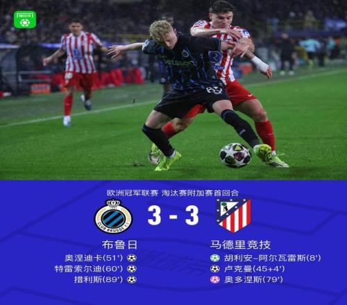 北京時(shí)間2月19日歐洲冠軍聯(lián)賽 淘汰賽附加賽首回合,布魯日對(duì)陣馬德里競技。布魯日奧涅迪卡破門,特雷索爾迪破門,措利斯破門,奧多涅斯自擺烏龍。馬德里競技胡利安-阿爾瓦雷斯破門,盧克曼破門。最終比分布魯日 3-3 馬競。