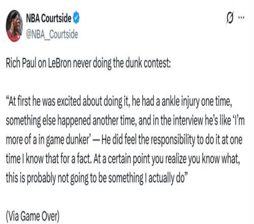 里奇保羅:詹姆斯沒有義務參加扣籃大賽贏了人們也會說暗箱操作