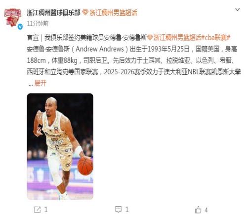 除此之外,浙江男籃官宣頂替約克的新外援安德魯-安德魯斯加盟:美國外援安德魯-安德魯斯出生于1993年5月25日,身高188cm,體重88kg,司職后衛(wèi)。安德魯斯先后效力于土耳其、拉脫維亞、以色列、希臘、西班牙和立陶宛等國家聯(lián)賽,2025-2026賽季效力于澳大利亞NBL聯(lián)賽凱恩斯太攀蛇俱樂部。