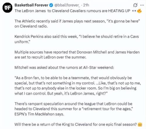 美媒TA也認(rèn)為下賽季詹姆斯一定會(huì)重返克利夫蘭,米切爾、哈登也會(huì)在今夏招募詹姆斯,美記蒂姆-麥克馬洪透露詹姆斯今夏可能重返克利夫蘭開啟一場(chǎng)‘史無(wú)前例的退役巡演’。