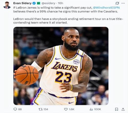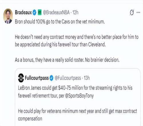 休媒Bradeaux寫道:詹姆斯絕對(duì)應(yīng)該以底薪加盟騎士,他不需要任何的高薪,因?yàn)樗诳死蛱m舉行退役巡演是眾望所歸,此外騎士隊(duì)的陣容非常強(qiáng)大,他重返騎士是一個(gè)再明智不過(guò)的決定。