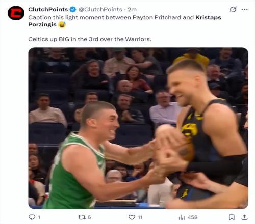 波爾津吉斯曾在23-24賽季跟隨綠凱一同奪得NBA總冠軍,隨后被綠凱放棄,但他與隊內(nèi)很多球員都有著深厚的情感,賽前杰倫-布朗跟波爾津吉斯相談甚歡,第二節(jié)波神獲得登場機(jī)會,4中2+三分2中1拿到5分1籃板。