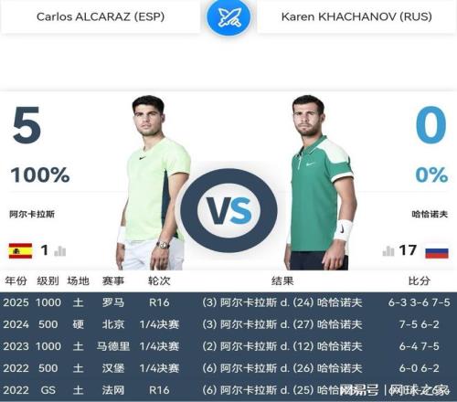 明天凌晨零點三十分,多哈站1/4決賽,阿爾卡拉斯迎來了俄羅斯雷神卡恰諾夫的挑戰(zhàn)。這是兩人職業(yè)生涯第六次交鋒,彼此知根知底,不像職業(yè)生涯第一次交鋒那么陌生,容易產(chǎn)生意外情況。不過,雖然阿爾卡拉斯此前五戰(zhàn)全勝,又何敢輕敵疏忽,小心被雷神之錘當(dāng)頭棒喝呢!
