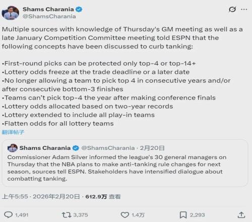 NBA官方計劃推出多項新規(guī)打擊故意擺爛:1、禁止球隊連續(xù)兩年獲得前四順位簽;2、連續(xù)兩年聯(lián)盟倒數(shù)前三的球隊不再獲得高順位簽;3.打進(jìn)分區(qū)決賽的球隊,第二年不能獲得前四順位;4、根據(jù)兩年的綜合戰(zhàn)績,分配樂透抽簽概率。