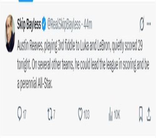 NBA名嘴斯利普-貝勒斯寫道:在詹姆斯、東契奇的身邊都能拿29分,如果他換一支球隊(duì)他有機(jī)會(huì)拿到得分王,并且有希望常年進(jìn)入全明星陣容。