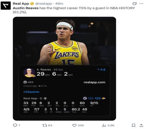 根據(jù)數(shù)據(jù)媒體Real寫道:里夫斯的真實(shí)命中率63.2%,他是NBA歷史上真實(shí)命中率最高的后衛(wèi)。