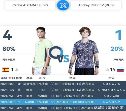 明天凌晨零點半,ATP500多哈站第一場半決賽,世界第一、西班牙全能戰(zhàn)士阿爾卡拉斯對陣世界排名第14的俄羅斯金絲猴盧布列夫。繼第一輪、第二輪法國選手林德克內(nèi)希和魯瓦耶之后,俄羅斯選手、前賽會冠軍卡恰諾夫和盧布列夫,前赴后繼挑戰(zhàn)世界第一阿爾卡拉斯,好不熱鬧!