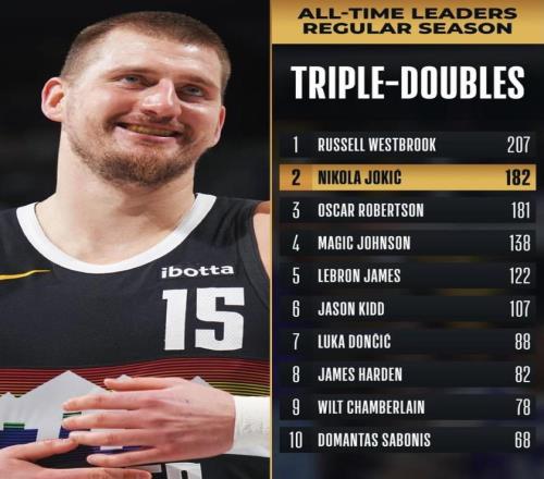 最新榜單里,威斯布魯克常規(guī)賽三雙 207次,約基奇 182次,差距是 25次。