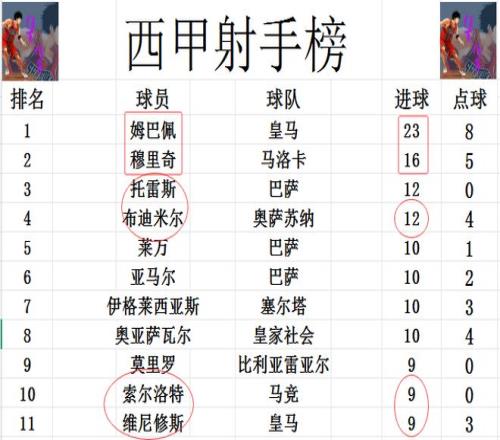 射手榜方面,姆巴佩破門(mén)被吹,今天未能進(jìn)球,還是23球領(lǐng)跑,穆里奇16球排在第2。布迪米爾今天打入一粒點(diǎn)球后,追上托雷斯,兩人12球并列第3。維尼修斯破門(mén),索爾洛特雙響,兩人追上莫里羅,將前十門(mén)檻提高到9球。