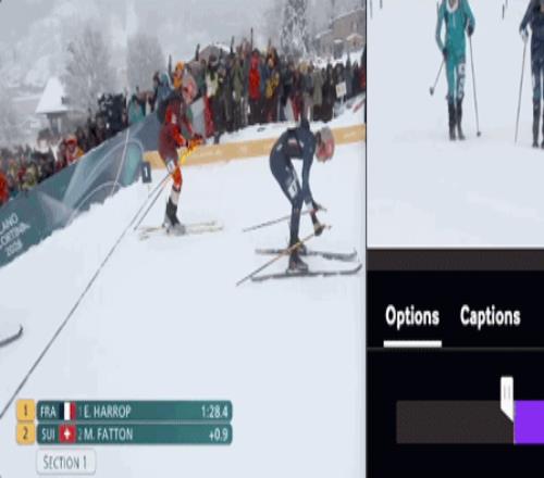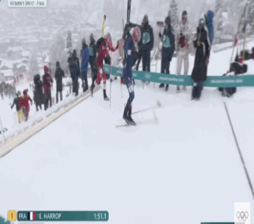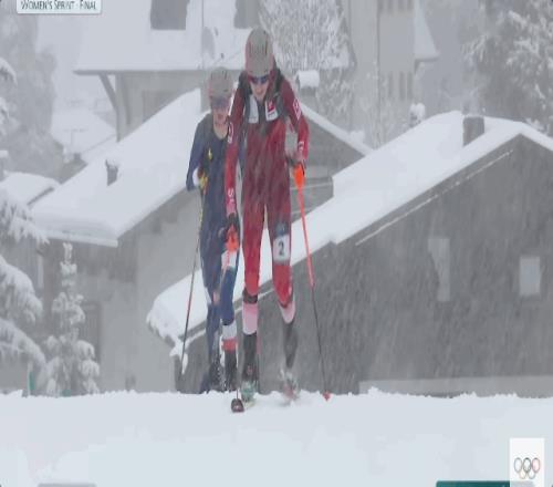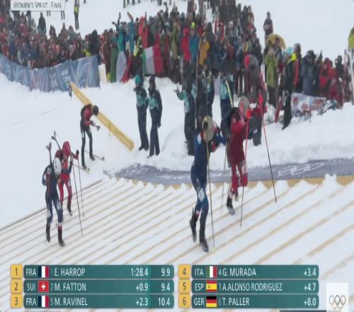 世錦賽三冠王、身穿藍衣頭戴灰粉色頭盔法國名將埃米莉·哈羅普無疑是女子短距離比賽的奪冠最大熱門,第一賽段和第二賽段的配速都遙遙領先,但是在轉換區(qū)穿板時她出現(xiàn)了明顯失誤,被瑞士選手、世錦賽雙冠王,身穿紅衣腳踩黃色雪板的瑪利亞內-法頓超越。