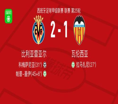 北京時間2月23日西班牙足球甲級聯(lián)賽 聯(lián)賽 第25輪,比利亞雷亞爾主場對陣瓦倫西亞。比利亞雷亞爾科梅薩尼亞破門,帕普-蓋伊破門。瓦倫西亞拉馬扎尼破門。最終比分比利亞雷亞爾 2-1 瓦倫西亞。