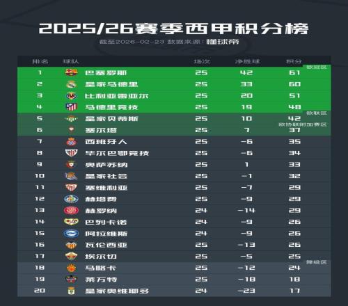 比利亞雷亞爾、馬德里競技分居積分榜第三、第四,目前身處歐冠區(qū)?;始邑惖偎古琶谖逄幱跉W聯(lián)區(qū)。排名第六的塞爾塔領(lǐng)先西班牙人2分身處歐協(xié)聯(lián)附加賽區(qū)。
