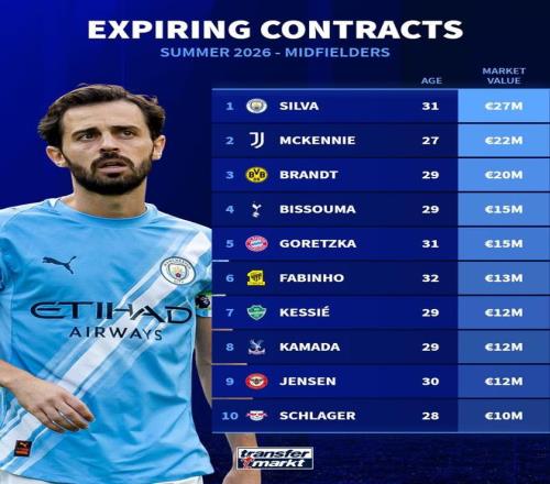德國轉會市場統(tǒng)計了今夏合同到期的十大中場,其中球員按照身價從高到低排序。
