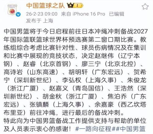 就在中國男籃抵達(dá)上海轉(zhuǎn)機(jī)的時(shí)候,中國男籃官方正式公布了14人名單,其中高詩巖留隊(duì),第一階段表現(xiàn)出色的龐崢麟落選,另外包括曾凡博、徐昕、徐杰等人也因?yàn)閭‰x隊(duì),根據(jù)計(jì)劃,中國男籃會(huì)在比賽前確定12人名單。