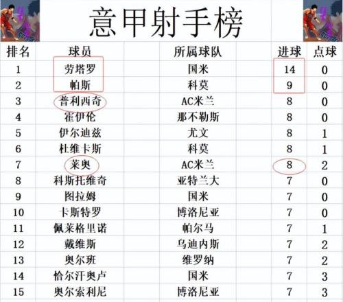 射手榜方面,勞塔羅14球領(lǐng)跑,帕斯9球位列第2。普利西奇,萊奧今天都沒有進球,還是和霍伊倫,伊爾迪茲,杜維卡斯8球并列第3。圖拉姆,佩萊格里諾,戴維斯等人7球剛好擠入前十。