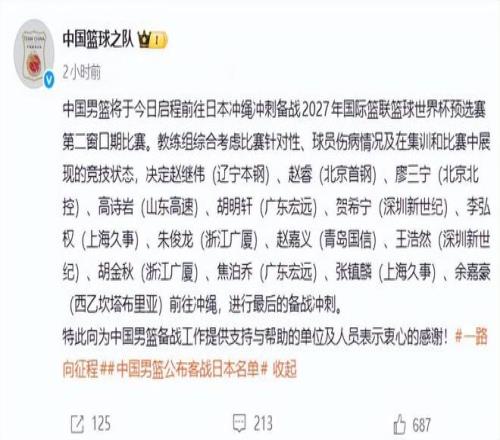 經過了長時間的集訓,中國男籃征戰(zhàn)世預賽的大名單正式公布。