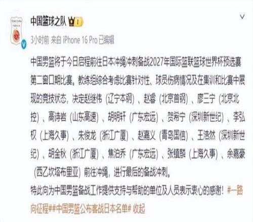 在CBA聯(lián)賽的這個(gè)窗口期里,中國(guó)男籃要打兩個(gè)世預(yù)賽客場(chǎng)比賽,對(duì)手分別是日本男籃和中國(guó)臺(tái)北男籃。日前中國(guó)男籃已經(jīng)飛往了日本沖繩,備戰(zhàn)26日客場(chǎng)和日本男籃的比賽。中國(guó)男籃方面也進(jìn)行了官宣,表示經(jīng)過綜合評(píng)估后,確定了出戰(zhàn)這兩場(chǎng)比賽的14人陣容,分別是:趙繼偉、趙睿、廖三寧、高詩巖、胡明軒、賀希寧、李弘權(quán)、朱俊龍、趙嘉義、王浩然、胡金秋、焦泊喬、張鎮(zhèn)麟、余嘉豪。余嘉豪會(huì)直接從西班牙飛往日本,和中國(guó)男籃會(huì)合。