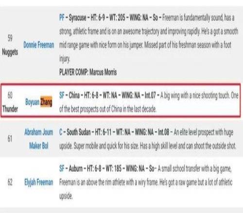 知名模擬選秀網(wǎng)站NBA Draft Room公布了最新2027年模擬選秀榜單,預(yù)測張博源次輪第60順位被雷霆選中,這是后者首次進(jìn)入主流模擬選秀網(wǎng)站的榜單。