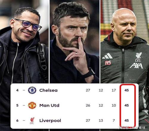 英超第27輪,9場(chǎng)比賽已經(jīng)結(jié)束,靜等曼聯(lián)最后出場(chǎng)。目前,英超積分榜形成一道奇觀(guān),切爾西、曼聯(lián)和利物浦三大豪門(mén),積分相同,都是45分,分別排在第四到第六,其中曼聯(lián)少賽一場(chǎng)。
