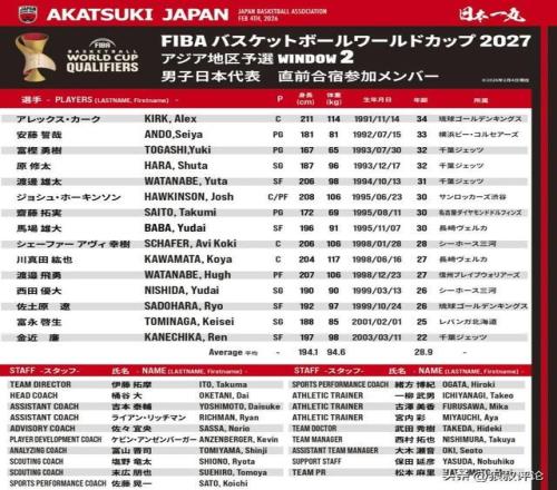 日本男籃集訓(xùn)名單如下: