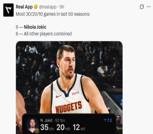7.過去50個賽季約基奇9次30+20+10,其余人6次;