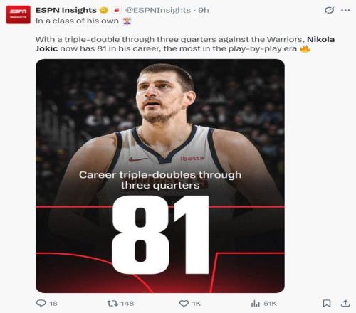 此役后約基奇再度創(chuàng)造多項紀錄:1.生涯第81次前三節(jié)三雙歷史第一;